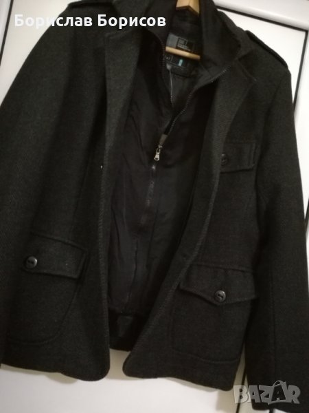 сигурност. Закопчан до горе ципа сформира висока яка, която умело предпазва от вятър. Този вътрешен кант може да бъде свален, като визията на палтото остава в стилна форма, тип сако. В областта на раменете са поставени специални каишки, тип пагони, които оформят елегантната визия на мъжкото, късо палто. В задната част е поставена цепка. Възможно е да е размер L, въпреки че по етикет е размер XL.