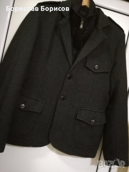 Чисто ново с етикет. Модерно, мъжко, спортно-елегантно сако в къса,практична форма. Самата кройка на модела е леко вталена, следваща линията натялото. Дължината осигурява възможност за комбинация както с дънки за ежедневието, така и с по-официален панталон за празничен повод. Закопчаването е посредством няколко копчета, като под тях е поставен памучен кант в тъмна форма за допълнителна