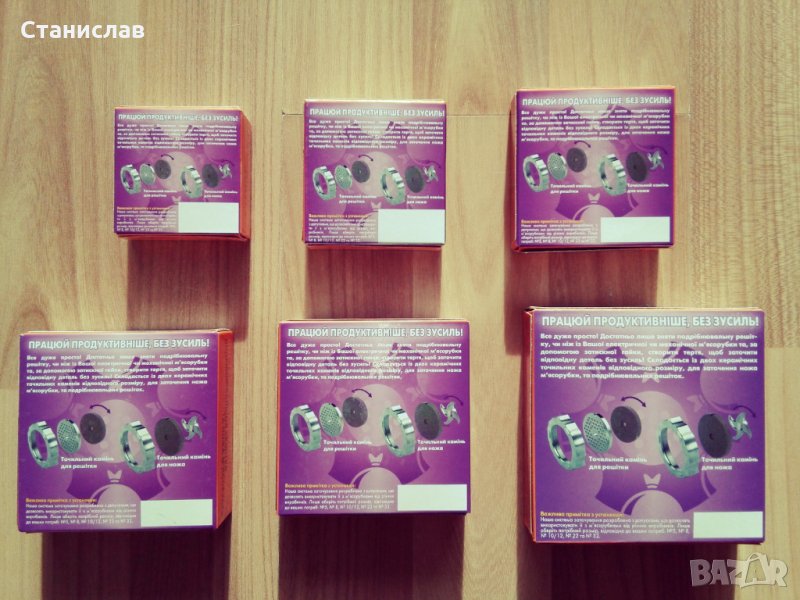 Предлагам много качествени точила за всички разпространени видове месомелачки: №5 №8 №10 (стават и за №12) №22(китайски) №22(Български електрически) и №32. Един комплект се състои от 2бр. камъни. Единият се поставя вместо решетката и по този начин заточва ножчето, а другият се поставя вместо ножа и съответно заточва решетката. Единственото изискване е процеса да НЕ е на сухо, а със задължително овлажняване на камъните (подхожда най-обикновена вода) ! Преди да сложите камъчето, необходимо е да го намокрите.
