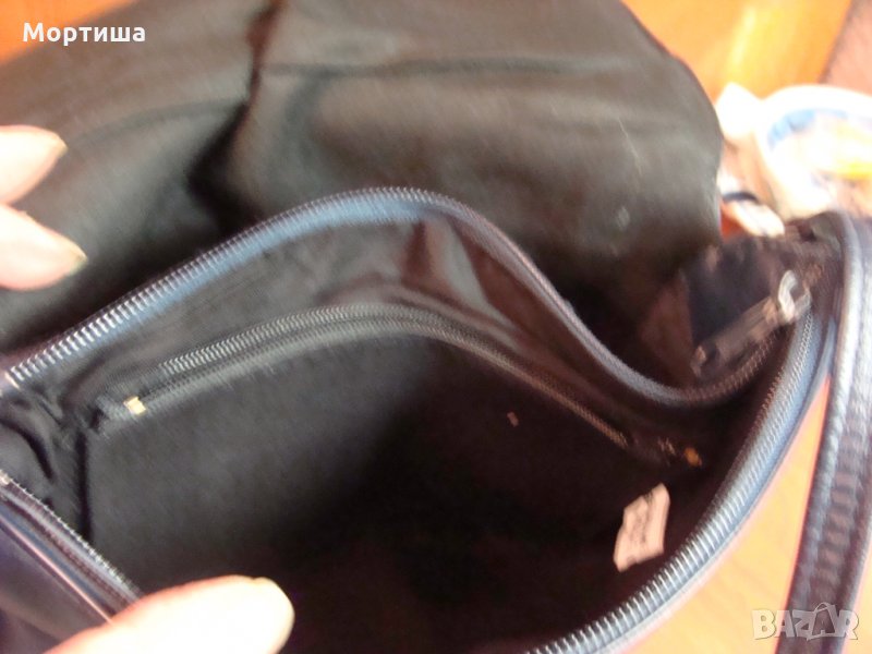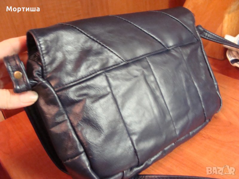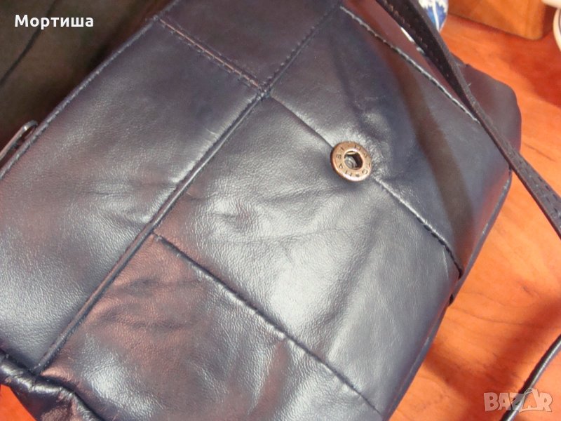 Естествена кожа тъмно синя Размер 28 на 2О см дръжката е 180 см,Чантата е с две основни отделения и по малко за документи основно закопчаване копче има допълнителен външен джоб с цип с етикет за състав Слагана е неколкократно без никакви забележки перфектна КРАЙНА ЦЕНА БЕЗ БАРТЕРИ
