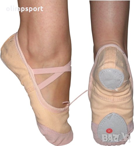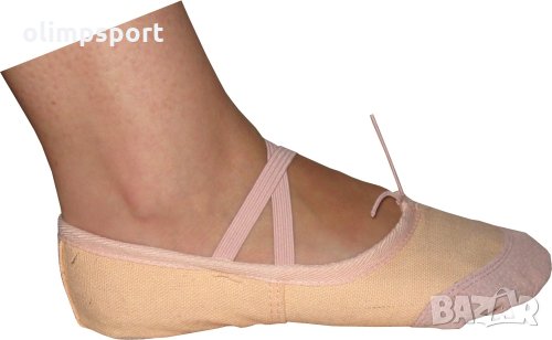 Танцови обувки - туфли нови. Предназначени за балет, танци и художествена гимнастика. Туфлите са изработени от здрав памучен плат и разделена кожена подметка с омекотяваща възглавничка на петите. Пришити кръстосани ластици на свода и еластична връзка за стабилно прилягане на туфлата по крака. Цвят: бял, черен, телесен. Налични размери - от 23 до 42номер. Материал: плат 100% памук и кожа. Подходящи за тренировки, репетиции, състезания и концерти.