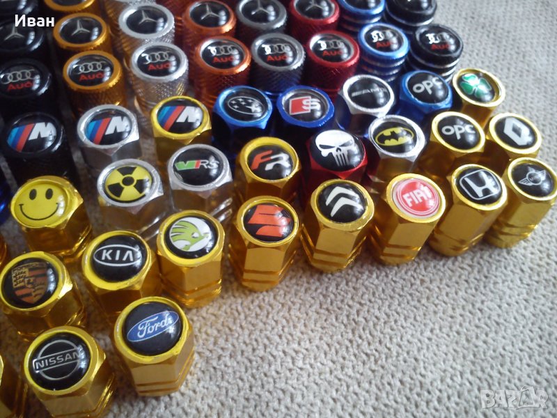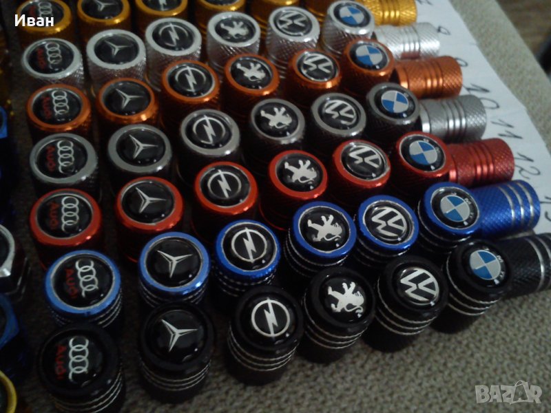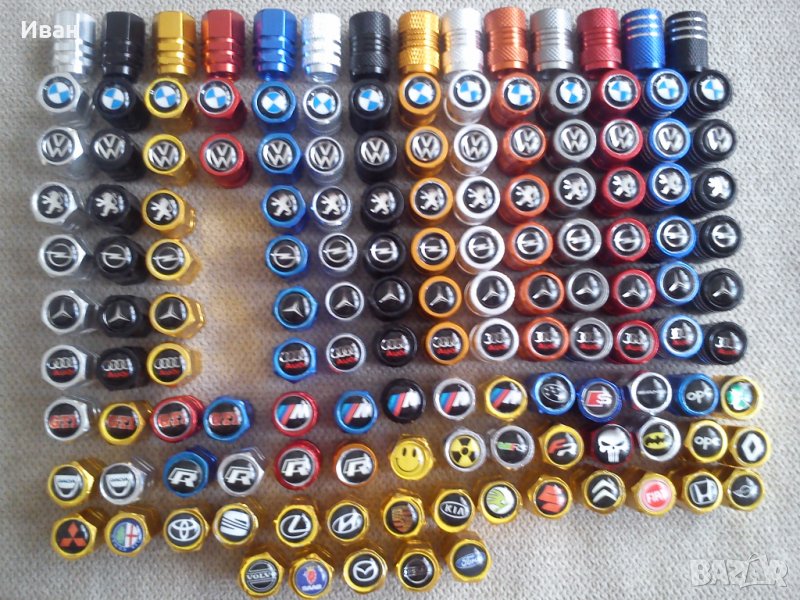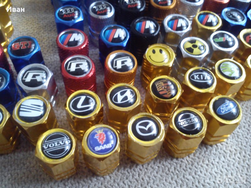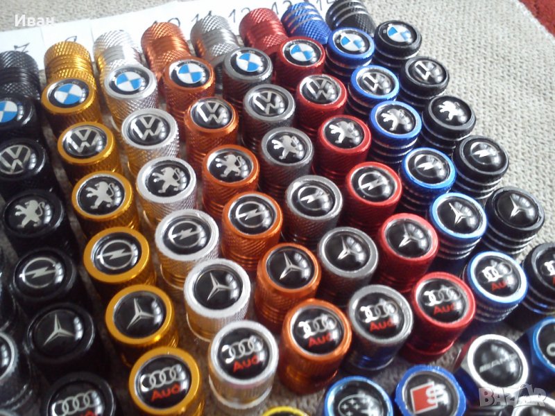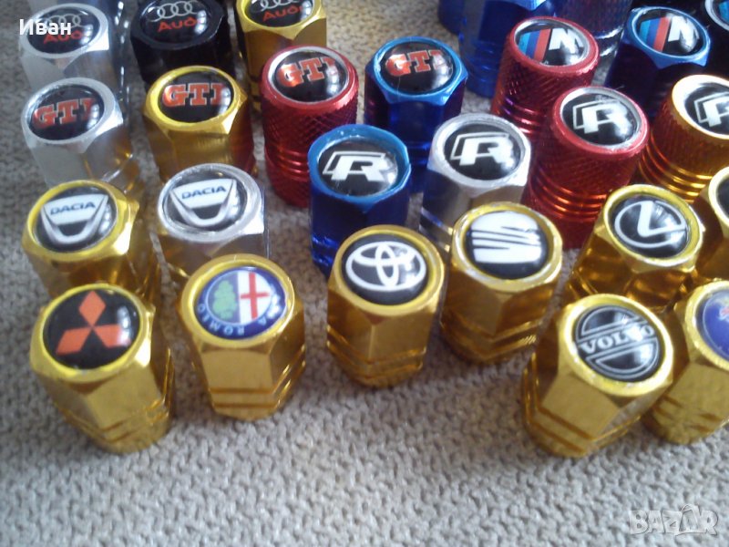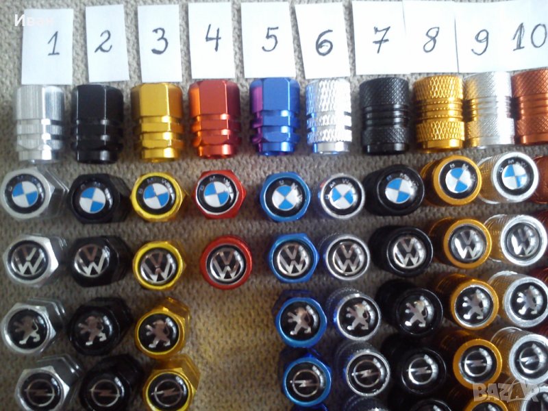 Продавам единствен вид на пазара на ниска цена качествени капачки за вентили от дебел твърд алуминий в различни цветове , кръгла и шестограмна форма с вградена емблемата в капачката.