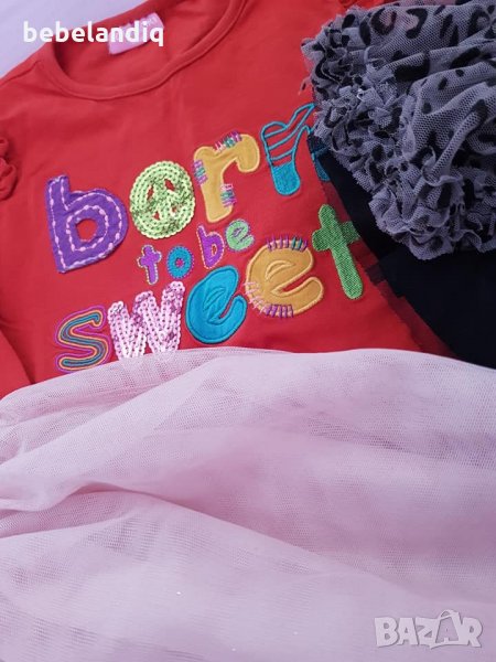 - цикламена блузка, нова, с етикет, с розова туту пола от последната колекция на НМ, подарък чорапогащник, червена блузка с паети по надписа, прекрасна многопластова пола /стои бухнала, много хубава облечена/ и отново подарък чорапогащник, общо 20 лв.;