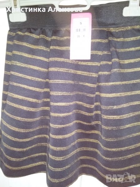 Продавам чисто нова черна пола със златисти ленти и широк ластик на талията. Дължината на полата е 42 см, обиколката на талията е 64 см и ширината на ластика е 5 см.