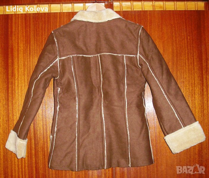 Кафяво, топло, късо кожухче от изкуствена кожа. Произведено в България, Хасково. Ново.