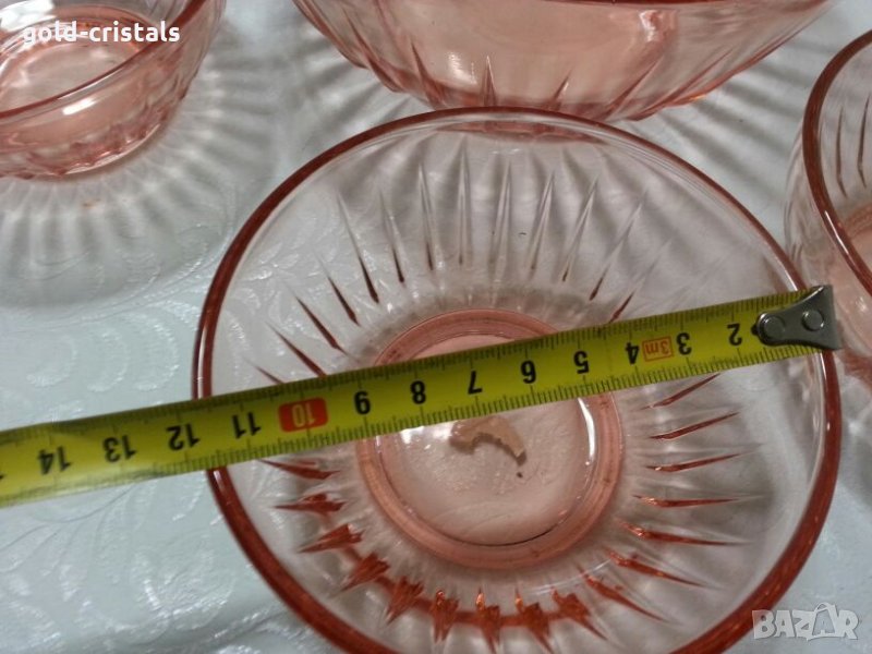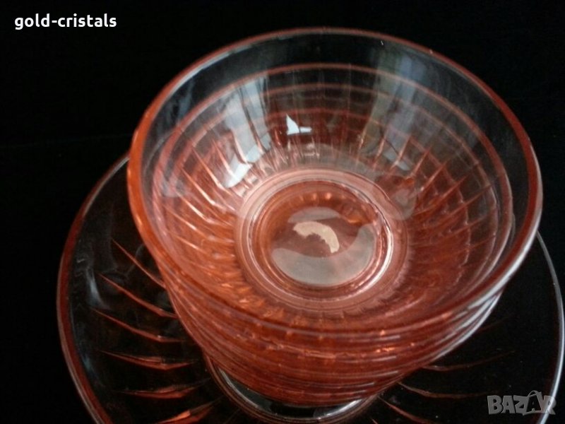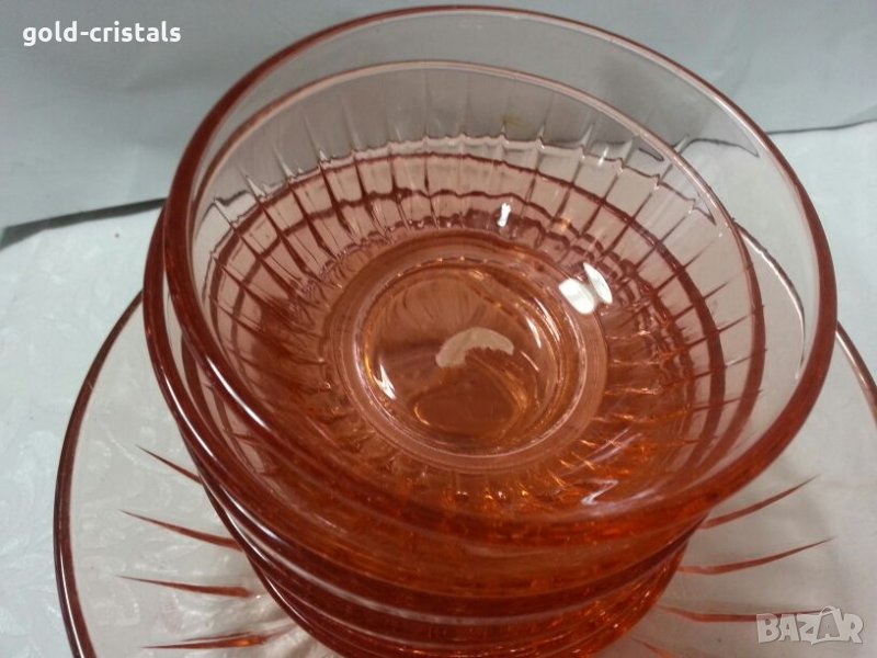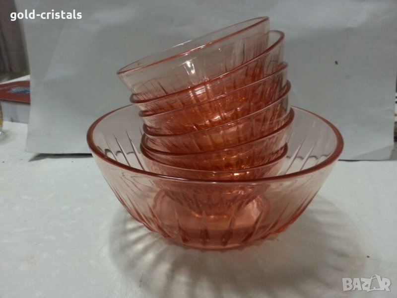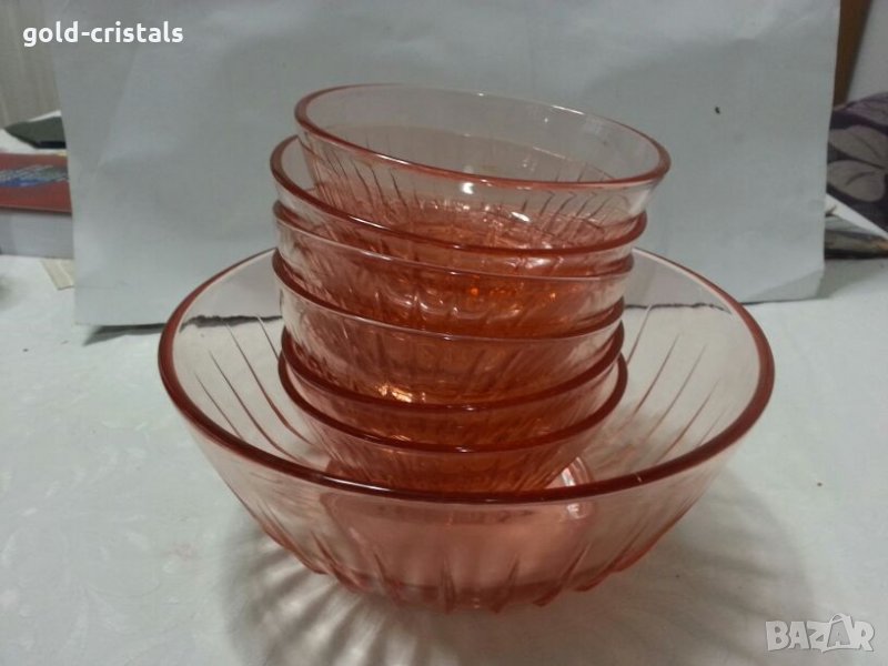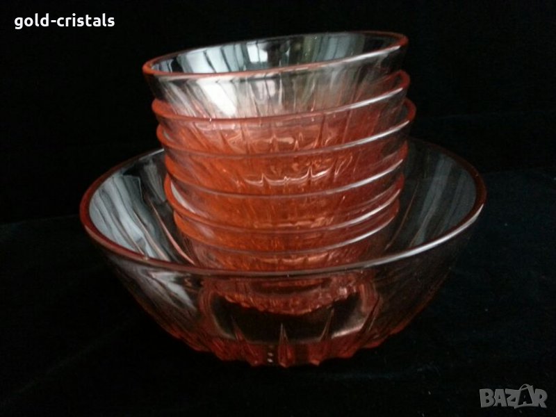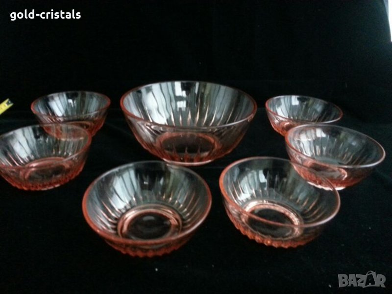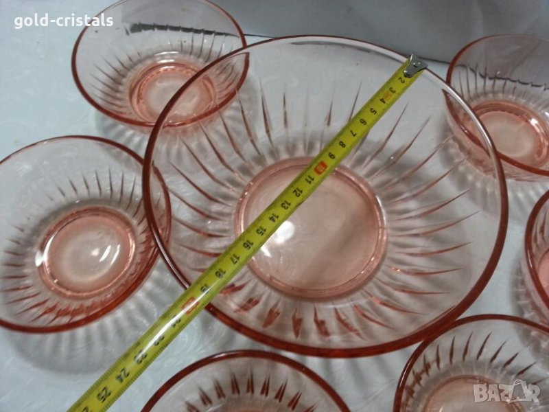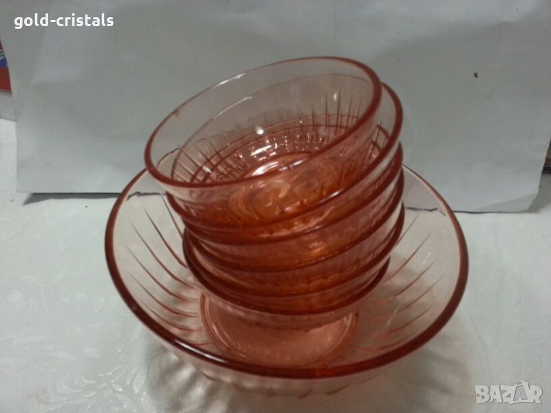 стари стъклени купа фруктиера и 6бр купички розово стъкло неупотребявани сервиз комплект сет лот цветно стъкло кристал гравирани изделия ретро арт декор винтидж колекция стари старинни антикварни предмети обзавеждане за дома и семейството подходящи за подарък за ценители и колекционери