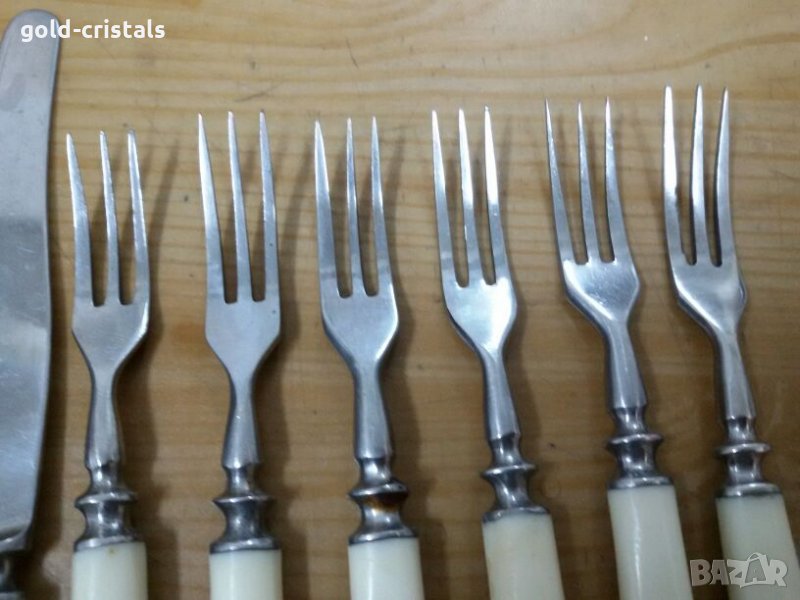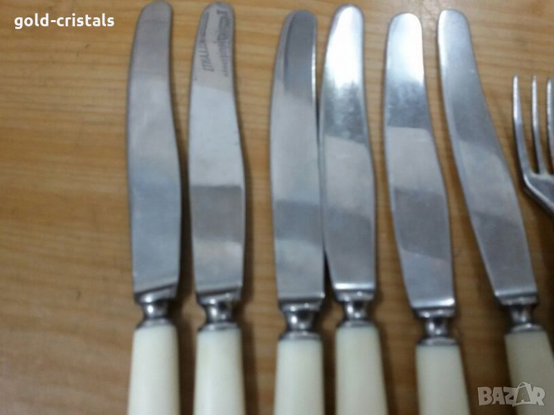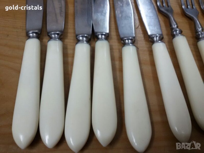 Стари руски десертни прибори 6бр ножове и 6бр вилици маркирани неръждаеми неупотребявани сервиз комплект сет лот съветски ссср ретро арт декор винтидж колекция стари антикварни предмети обзавеждане за дома и семейството подходящи за подарък за ценители и колекционери ножче и виличка за допълване 20лв