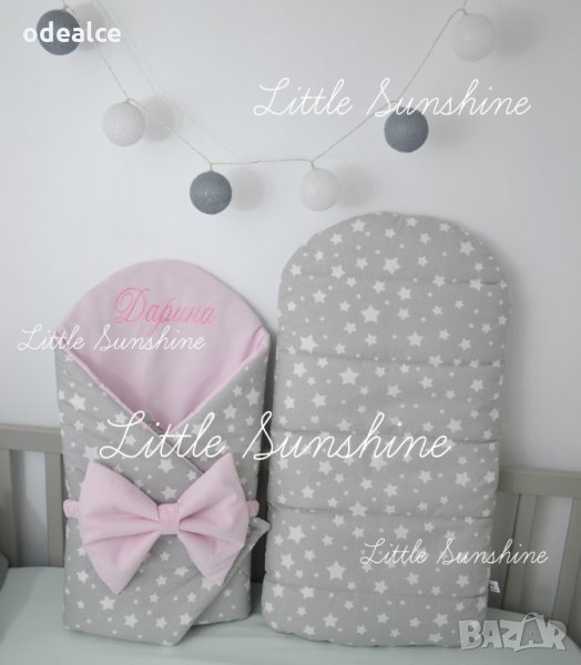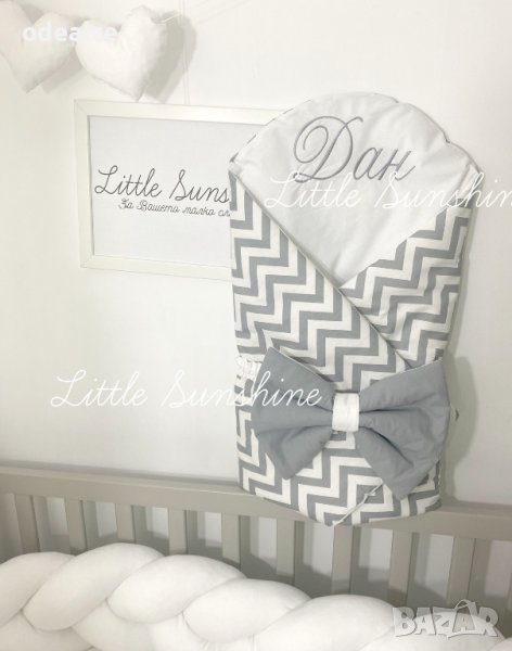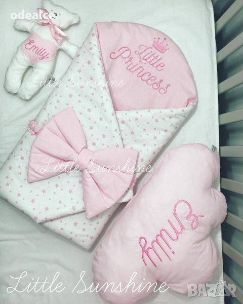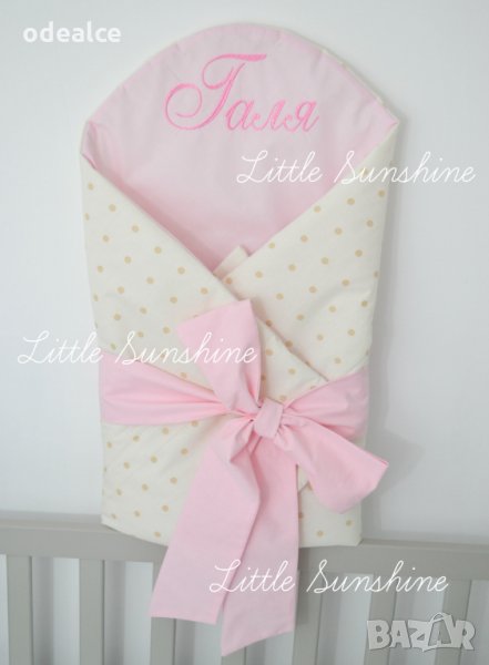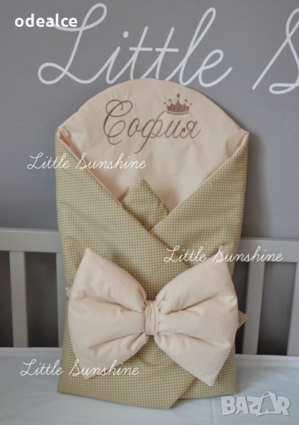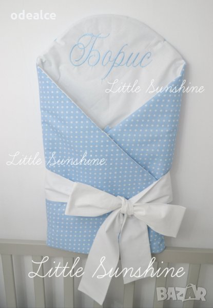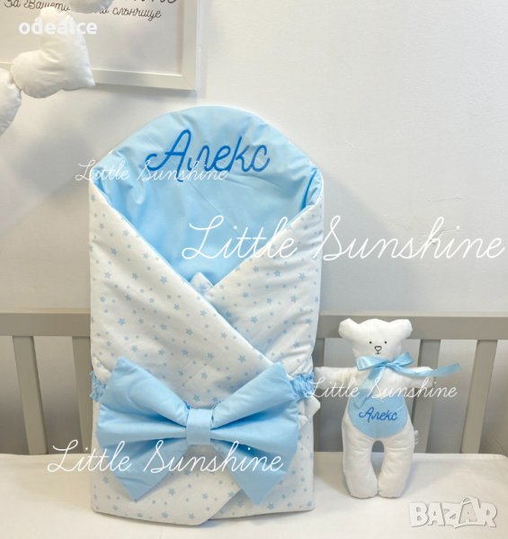 Персонализираното Одеалце Little Sunshine тип "прегърни ме" за бебчета е практично, красиво и много удобно. Малките съкровища ще бъдат защитени и внимателно загърнати с това меко одеалце ( пелена ), направено от 100% естествени материи. Помощните залепващи се страни осигуряват комфорт и сигурност. Важно е да отбележим, че е и бързосъхнещо. Повиването на новороденото бебенце става бързо и лесно, много удобно за одеялце за изписване ( порт бебе ) , подходящо за разходки с количката, сладък сън вкъщи, за подарък. Различни десени по избор, луксозна здрава бродерия!