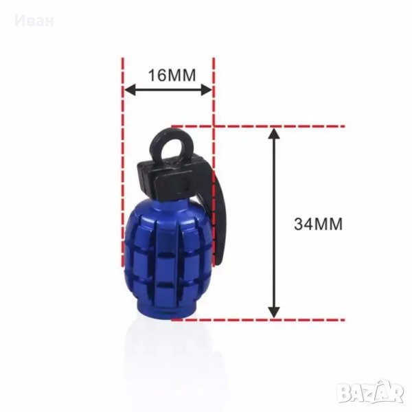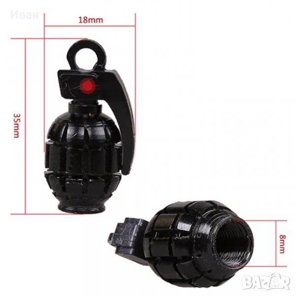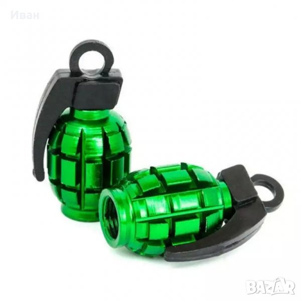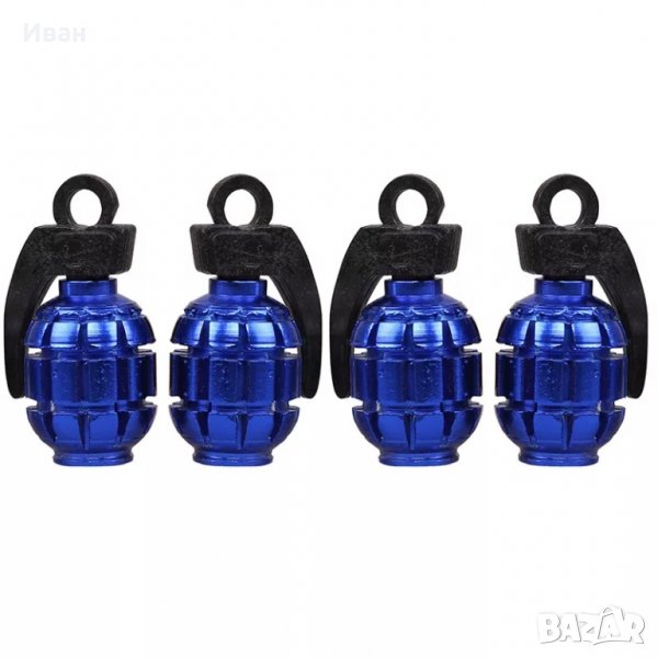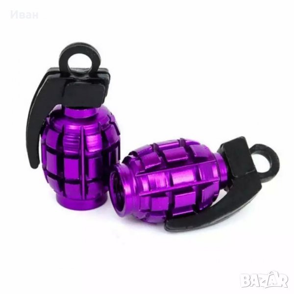 Продавам и метални капачки за вентили на гуми подходящи за коли , камиони , бусове , джипове , мотори , мотопеди , скутери , велосипеди и т.н. с форма на патрони , гранати , зарчета , футболни топки и усмивки .