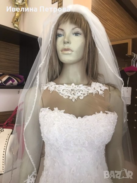 Роклята е шита от българската дизайнерка София Борисова. С камъни Swarovski е, има дълъг воал. Самата дантела е с много високо качество с орнаменти. Има подплънки за бюста. Има и чантичка към роклята, правена също по поръчка. Подходяща за жена ХС и С размер. Роклята е след химическо почистване. Без никакви забележки. Изпращам с опция преглед. Воалът е продаден.
