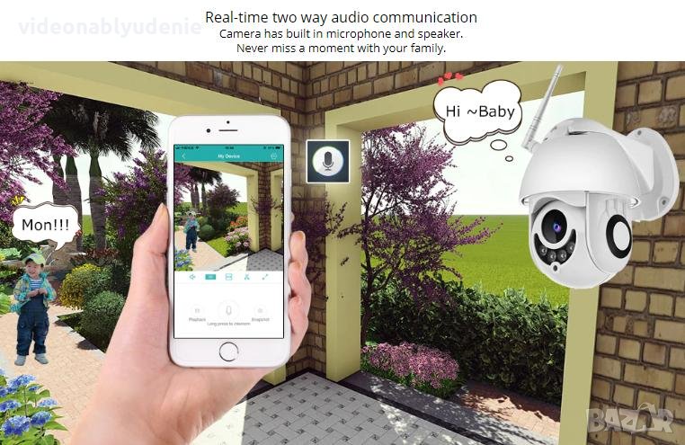 Камерата има вграден двупосочен интерком, т.е. можете да чувате, какво се говори около камерата, а също така можете и вие да говорите от смартфона или таблета си и намиращите се до нея, да ви чуват!