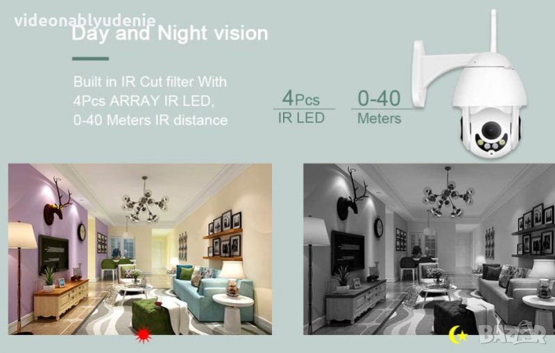 Управляема водонепромокаема камера с качествена IR подсветка от 4 броя LED Array диода, предоставя ясно и изчистено изображение до 40 метра през нощта.