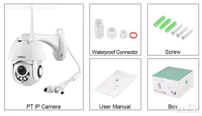 Пакета съдържа: Камера, Отвертка, Упътване на Английски Език, Упътване на Български Език, Стойка, 3 бр. винтове и завинтващ механизъм за тях, Водонепромокаем конектор