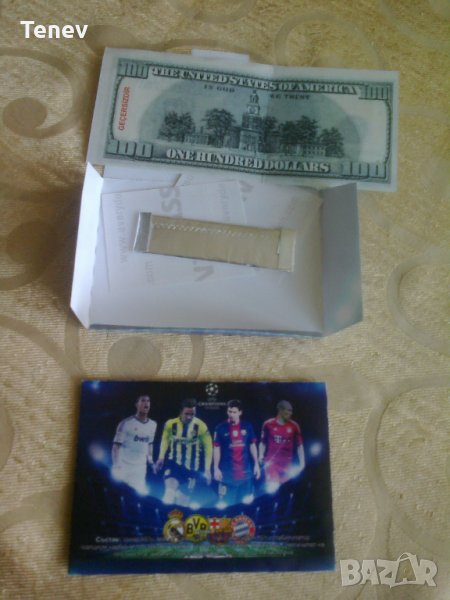 Дъвката е в картонче, с 2 бр. картинки--лепенки на футболисти + копие на банкнота 100 $. Цената е обща. Изпращам и по пощата !