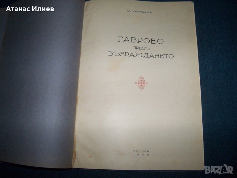 "Габрово през Възраждането" автор Ал. П. Мартинов. Книгата е издадена през 1940г. , отпечатана в акцидентна печатница И. Немечек гр. София. Книгата е 146 стр. подвързана с твърди корици и е голям формат. Книгата е в отлично състояние. Размери 325 х 235 мм.
