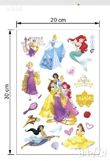 Малък лист с принцеси Малката русалка Ариел Белл Рапунцел Жасмин Пепеляшка стикер за стена и мебел → Обява 24256131