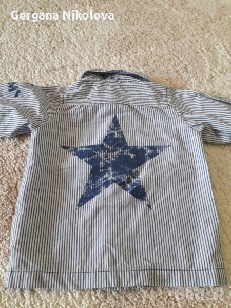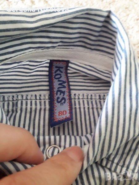 В перфектно състояние е,без грам забележка,като нова.Ризата е българско производство със 100% памук ,размер 80 и се облича страшно лесно ,заради тик так копчетата.