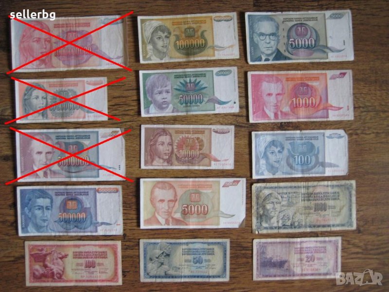 Банкноти от Югославия от 80-те и 90-те години - номинал от 20, 50, 100, 1000, 5000, 10 000, 50 000, 100 000, 500 000.