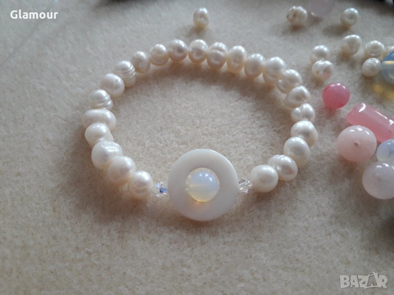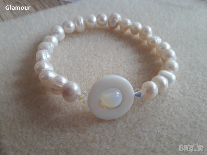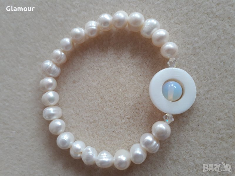 Ръчно изработена гривна с перли/сладководни/,лунен камък,седеф и кристали.С еластична корда.