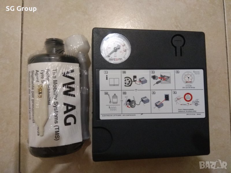 Има и оригинален уплътнител при спукване на гума, достатъчен е за ремонт на 2 гуми.В срок на годност до 2023год.Помпа до 8bar.