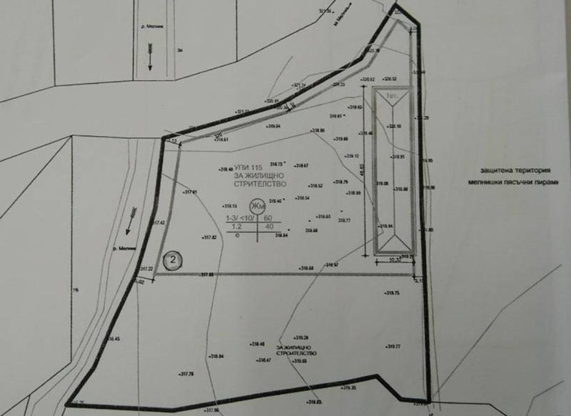7000 кв.м. граничещ с река Мелнишка Бистрица, Мелнишки пирамиди и главният път Сандански-Мелник.
