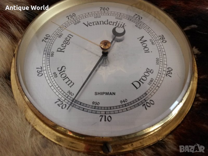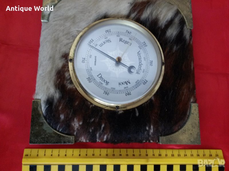 Уникален Рядък Много Красив Стенен Голям Немски БАРОМЕТЪР с Естетвена Ярешка Козина / Кожа /и Месингов Обков. Състоянието е видно.