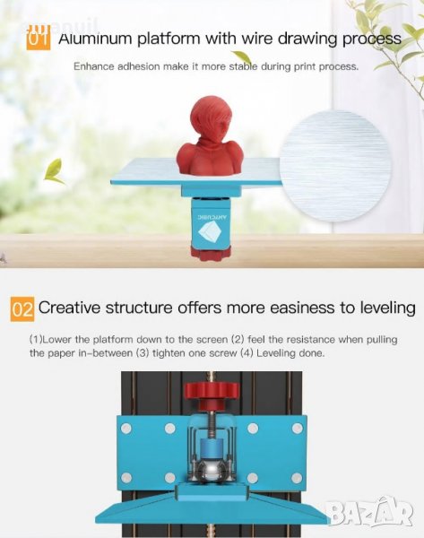 Еинствено при ANYCUBIC разработка с един болт за стягане/освобождаване на ябълковидната връзка която се самонагажда при нивелиране на основата за която залепва принтирания детайл.