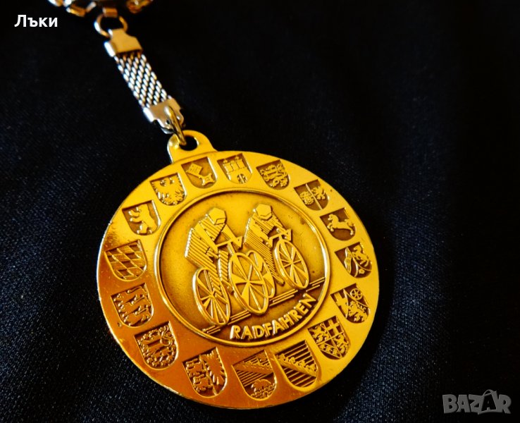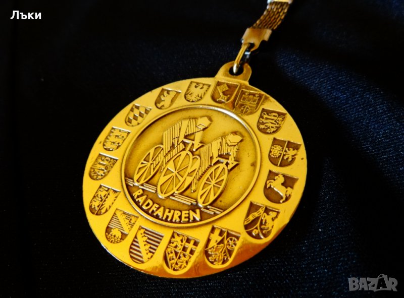 Стар месингов ключодържател с колоездене.Има релефно гравирани велосипедисти и много гербове на различни немски области,градове.Дължина 12 см.,диаметър 4.5 см.,тегло 35 гр.