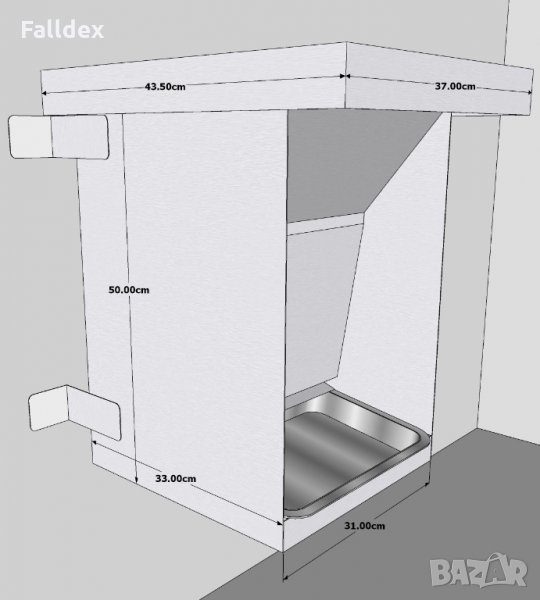 Хранилката е изработена от поцинкована ламарина, прахово боядисана.