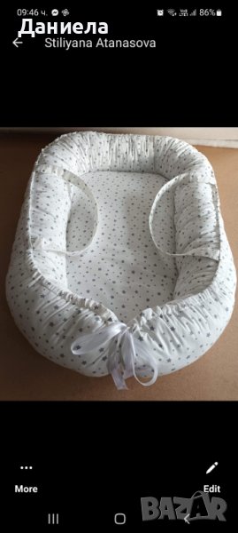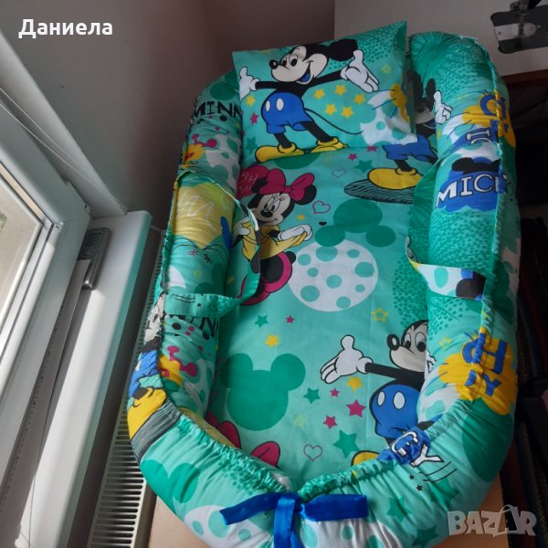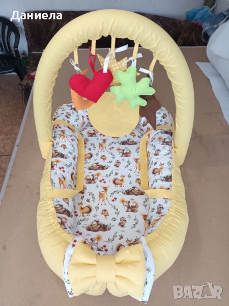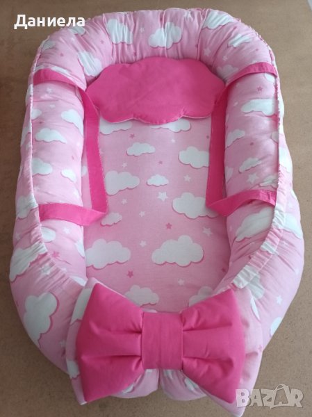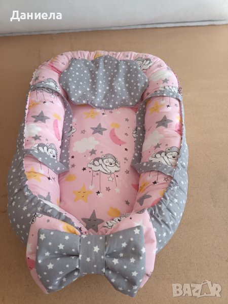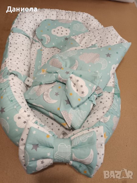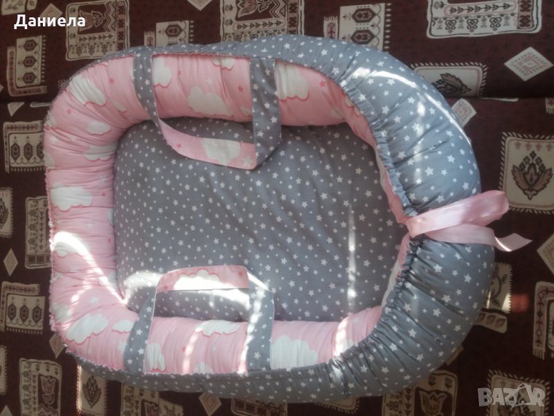 Практично и комфортно бебешко гнездо. Може да се сложи в кошарата, на леглото, дивана, когато сте на гости, или на път. Пълнежът е от хипоалергичен силиконов пух и вата. Вътрешни размери 33/70.Тегло 1кг. Изработвам по поръчка в желан цвят. Предлагам и среден размер 80 на 40 и голямо гнездо с размери 100 /50 Цената е само за гнездо малък размер без дръжки, възглавничка и панделка. . Изработвам също спални комплекти за кошара от същите десени, олекотени завивки, обиколници, възглавници за кърмене, чанта за памперси и козметика пелени за повиване и др.за бебето Тел. 0889354990