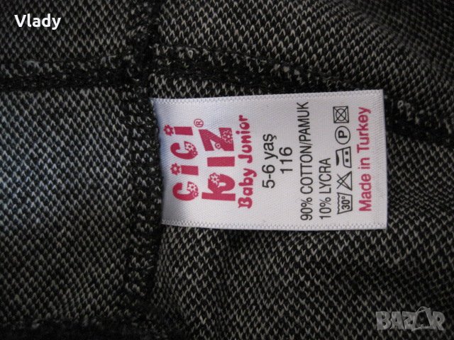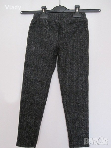 Ново мекичко панталонче с апликации и два ципа, сиво и черно, за ръст 116 см, 5-6 год, 90%памук, 10%ликра. Размери: талия(ластик)-26 см, дължина-66 см.