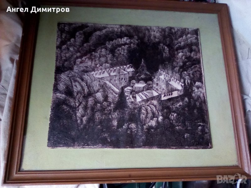 Прекрасна картина офорт Рилски манастир Елка Найденова , 45-38 см с дървената рамка и стъкло