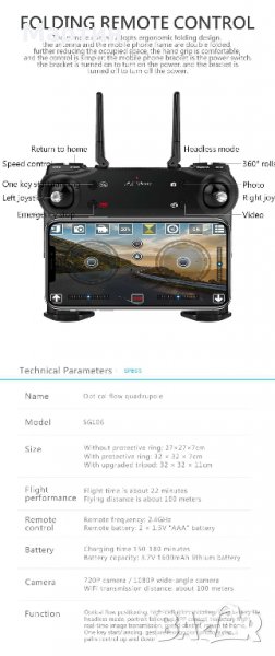 Функции: нагоре / надолу, напред / назад, завой наляво / надясно, страничен полет, LED светлина, режим без глава, автоматичен връщане на един клавиш, оптично позициониране на потока, проследяване на полета, режим на височина за задържане, жест за движение, видео