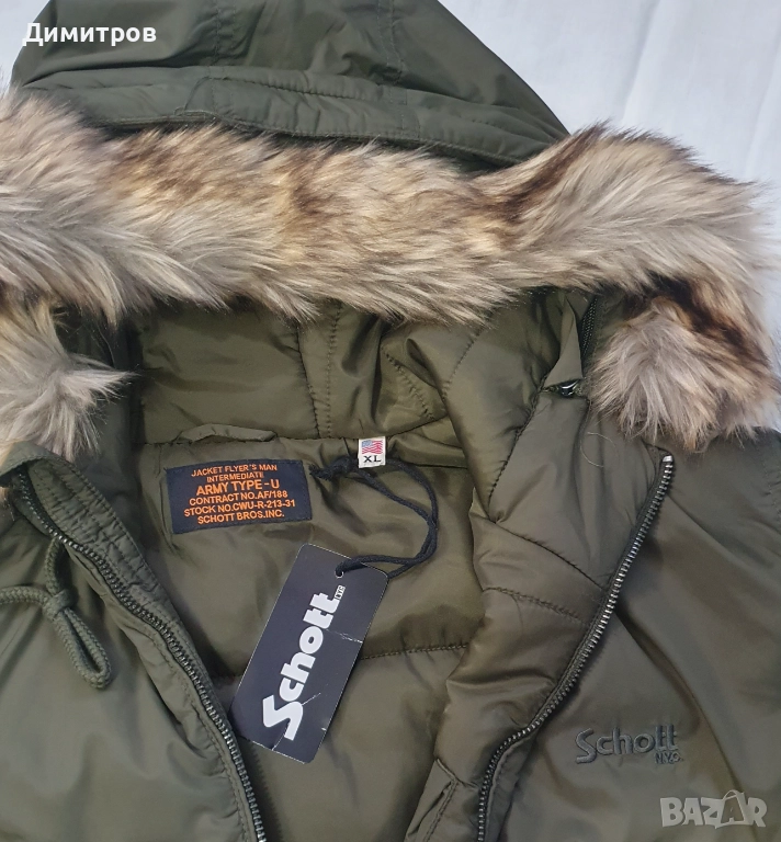 1. Унисекс яке, тип бомбър Schott N.Y.C. - ново, с етикет. Налични 2 броя - тъмно-зелено и черно, размер XL. "Порчето" на качулката може да се сваля.
