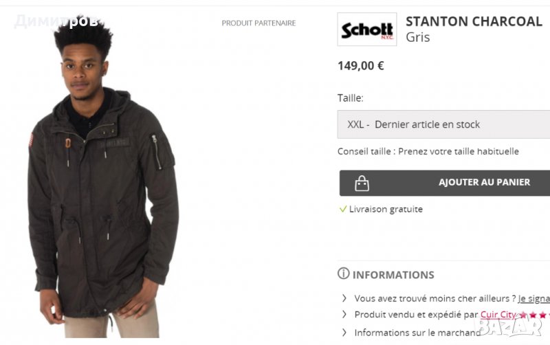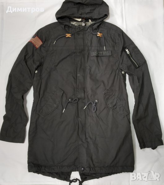 3. Парка SCHOTT - нова, с етикет. Еднослойна, подходяща за преходния сезон, 100% памук. По етикет е ХL, но отговаря на L. Цвят - тъмно сиво-зелено. Размери : Дължина на гърба под качулката - 82 см