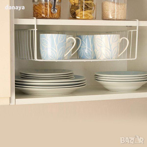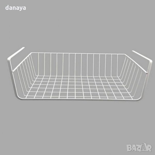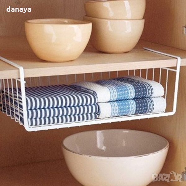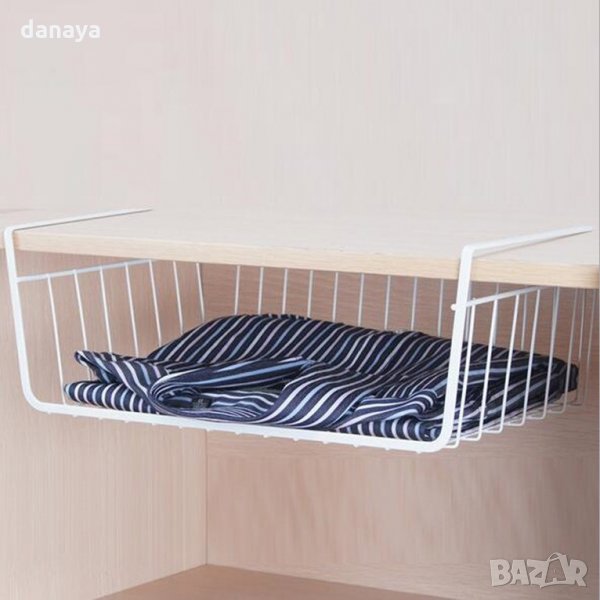 Мултифункционален метален допълнителен рафт за пестене на място. Кошница, органайзер за закачане, който се поставя под кухненски рафт, рафт в банята, или в гардероба. Универсална метална етажерка с куки за закачане, която пести място, където и да я сложите.