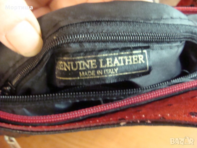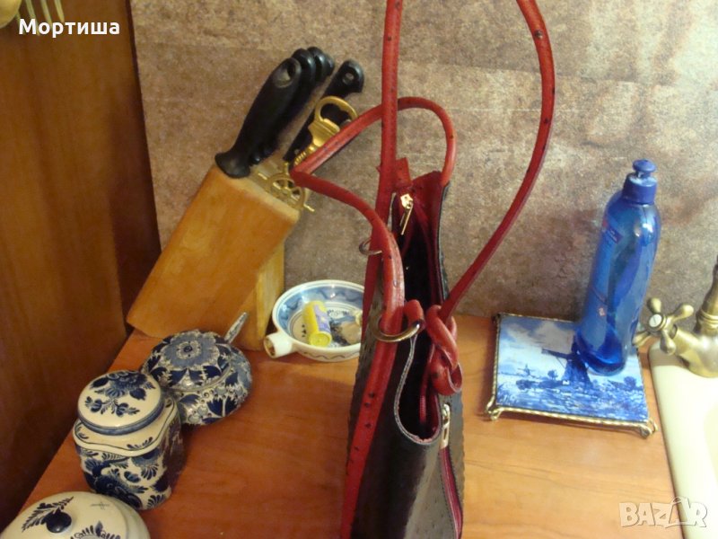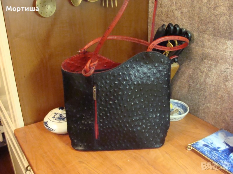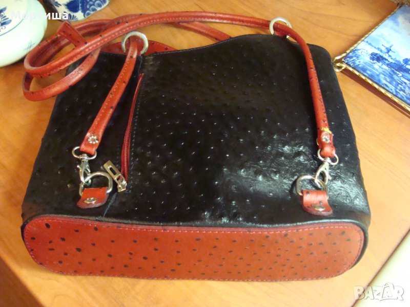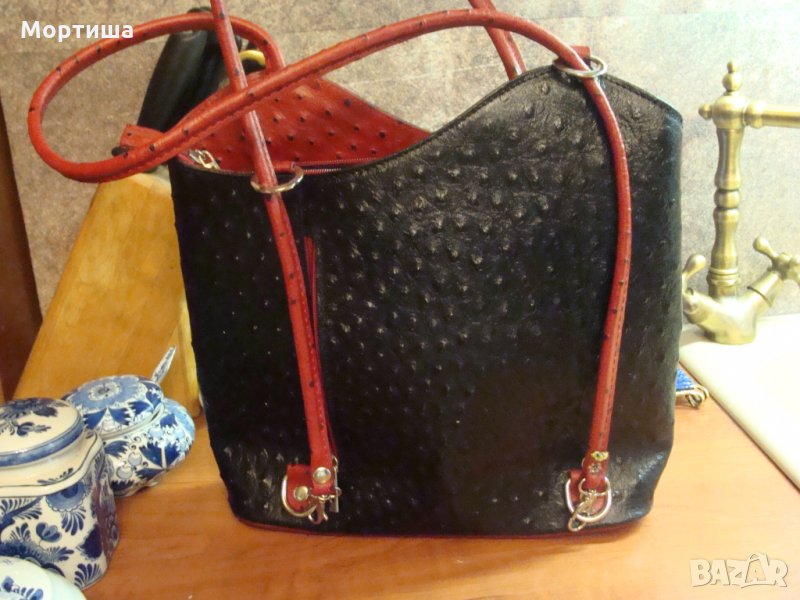 От щраусова кожа Чантата практически е нова подарък който не съм използвала повече от веднъж Черно и червено Размер 30 на 28 см твърда кожа Основно закопчаване цип С три основни отделение едното от който с цип едно малко за документи и още един джоб за телефон .Цената не подлежи на коментар .Без бартери