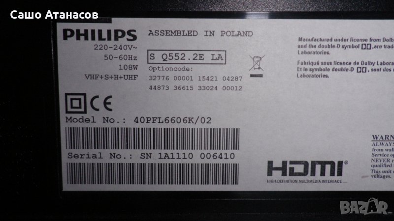 PHILIPS 40PFL6606K/02 със счупена матрица ,PLDE-P007A ,LK400D3LB43 ,313912364954 WK:1046.2