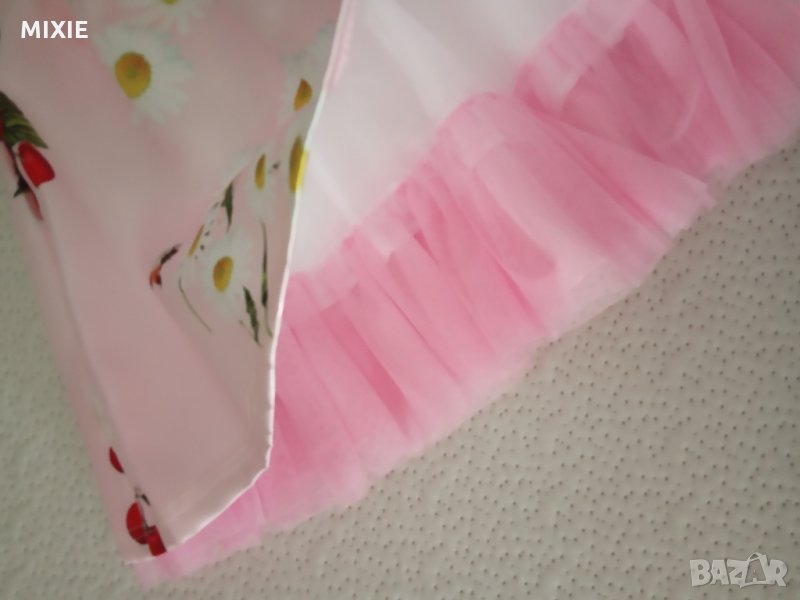 Нова красива детска рокля с черешки, цвят - светло розово. Размери - 86 см, 92 см, 98 см, 104 см, 110 см, 116 см. БГ производство. Изработена е от памук, сатен и полиестер, с подплата в долната част. Подплатата завършва с тюл за по-голям обем.