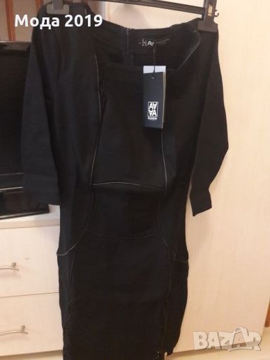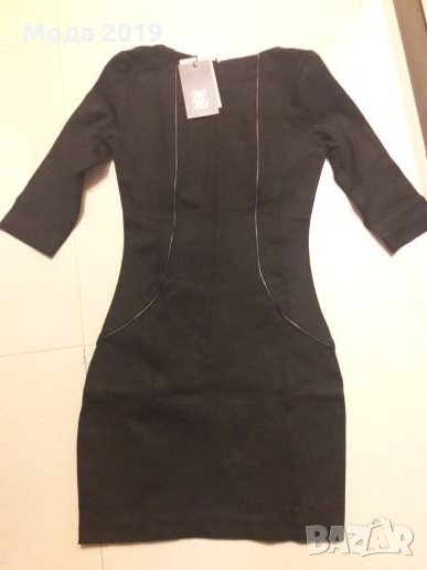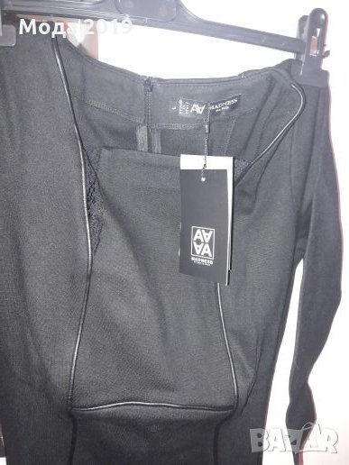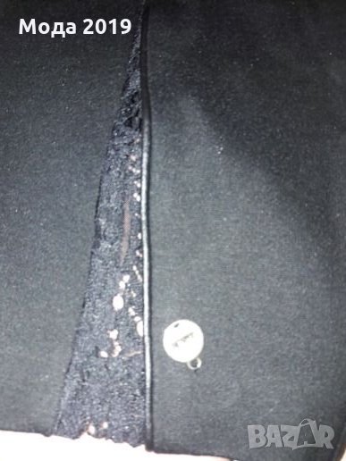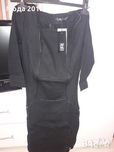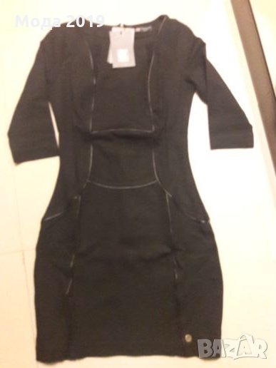 Маркова рокля. Плътна материя. С черни кожени кантове и дантела. Може да стане и за М размер. Ръкав до лакътя. Стои страхотно. Италианска. Черен цвят със златисто метално лого.