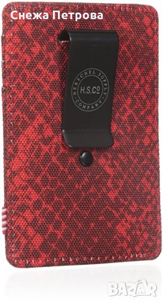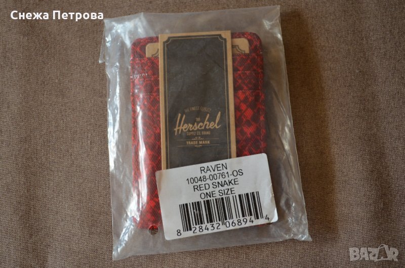 Чисто нов картодържач с етикета и в оригиналната си найлонова опаковка. Оригинален на фирмата Herschel, а модела е Raven. Изработен е от 100% полиестер в цвят по етикет "Red Snake". Актуален е и за повече информация в интернет.