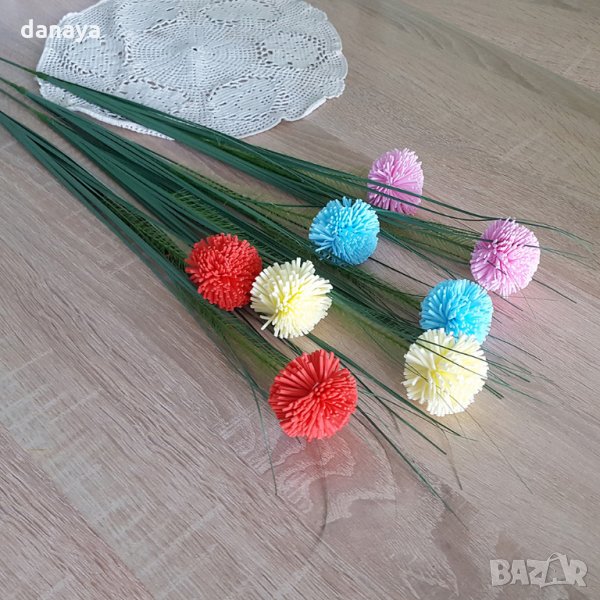 карамфили, висока тревичка, изкуствено цвете за декорация и аранжиране. Изкуствена клонка тревичка с две цветенца, която може да се аранжира в букети, вази или саксии. Тревичка украса - чудесна пролетна декорация за дома, украса декорация за великден.