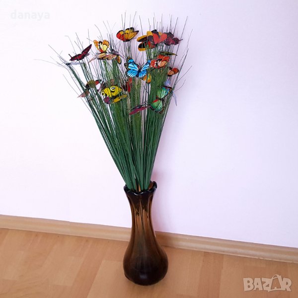 Изкуствен букет, висока тревичка с две пеперуди. Изкуствена клонка тревичка с две пеперудки, която може да се аранжира в букети, вази или саксии. Тревичка украса - чудесна пролетна декорация за дома, украса декорация за великден.