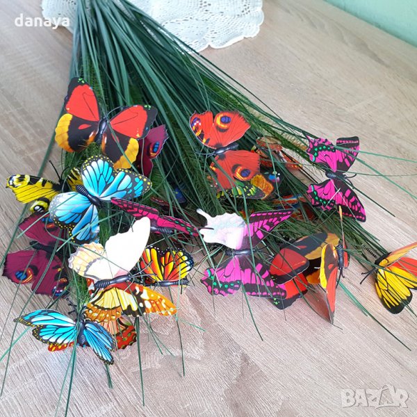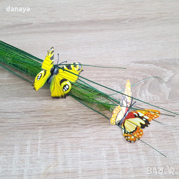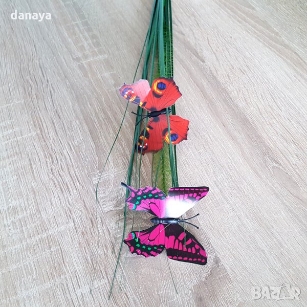 Всеки стрък е с дължина 76см. Пеперудите са изработени от PVC материал. Стабилна дръжка. Цената е за стрък тревичка с две пеперуди в различен цвят на крилата.