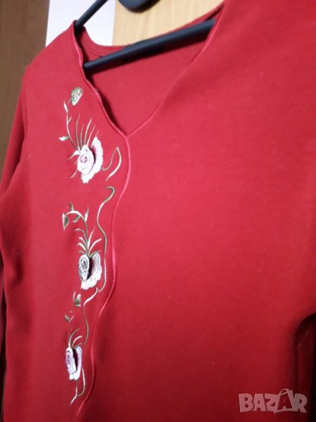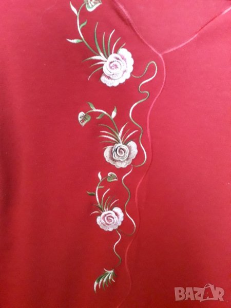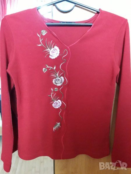 Дамска блуза с дълъг ръкав, наситен червен цвят, с избродирани рози като апликации. Размер около 42-44 българска номерация, или S-M европейска. Отговарям на съобщения тук, или т. 0887780808, изпращам с куриер с отстъпка, преглед и тест, или лично предаване в София.