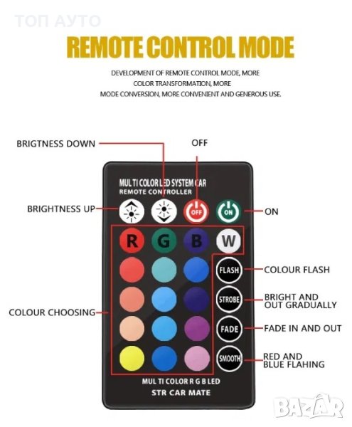 Ефектни, универсални габаритни крушки с различни цветове и комбинации. Множество комбинации - възможност за усилване и намаляне на светлината, различни цветове на всяка от крушките, режим американска полицейска кола (премигваща синя и червена светлина и много други.