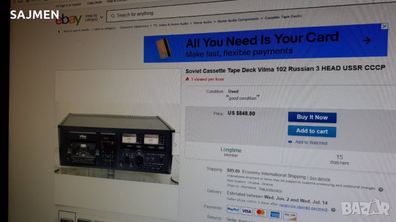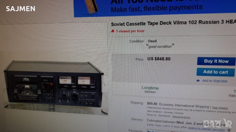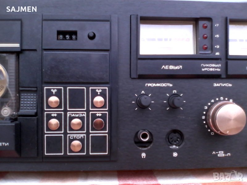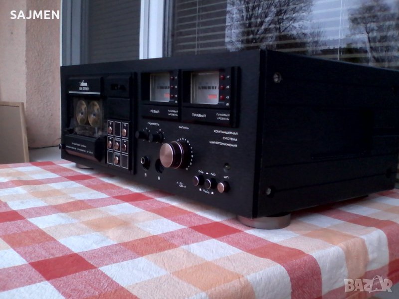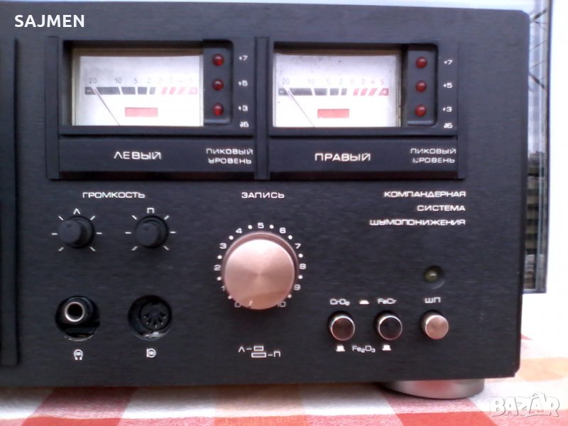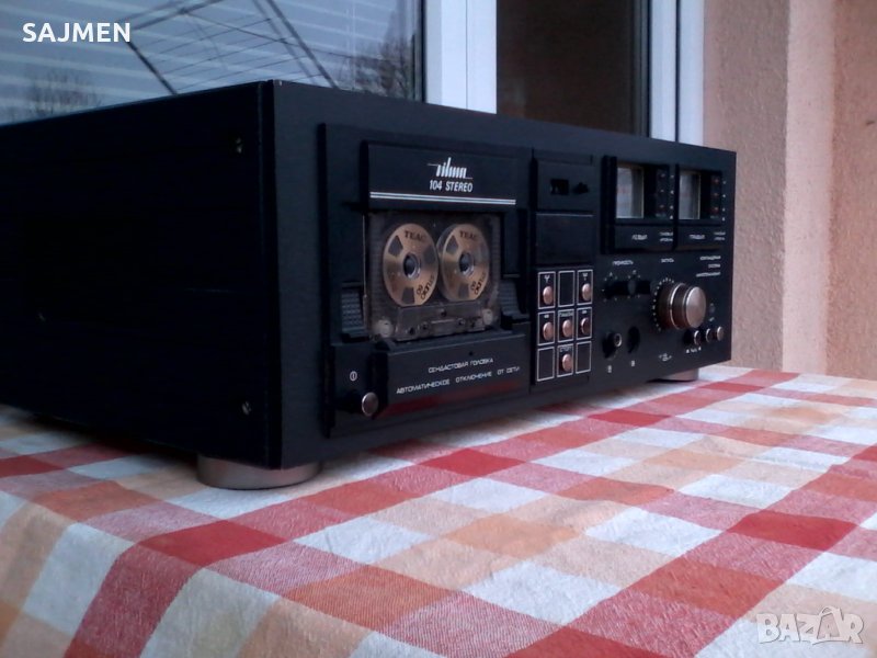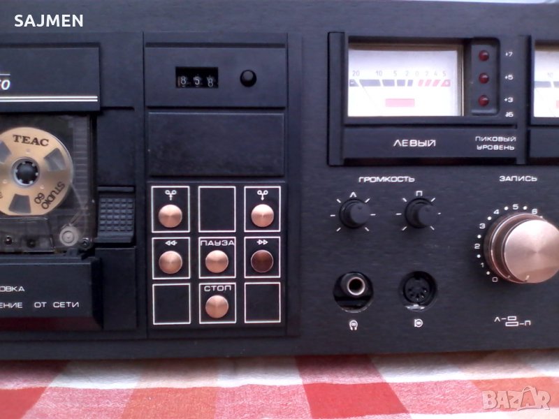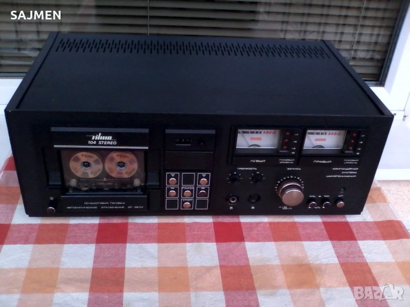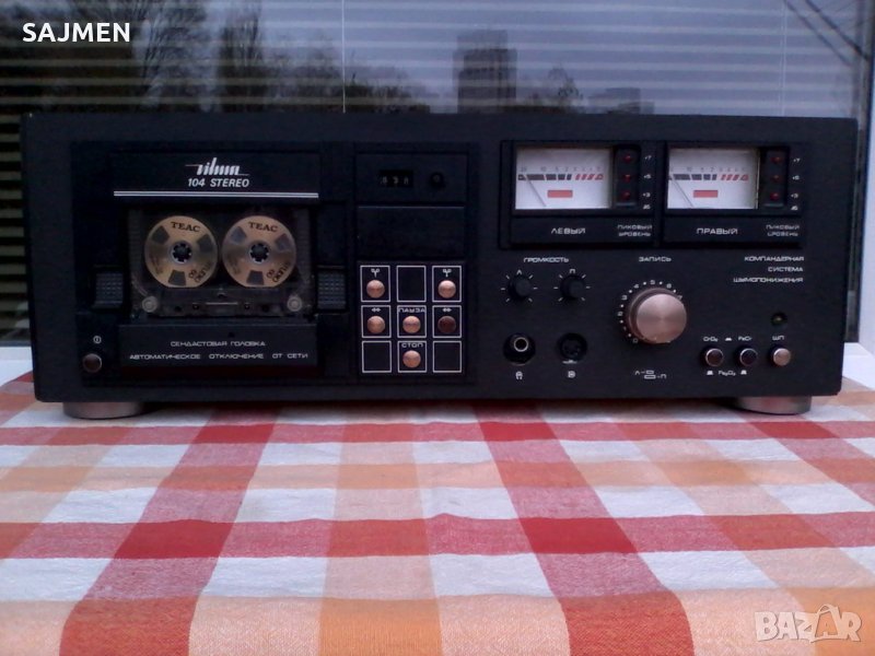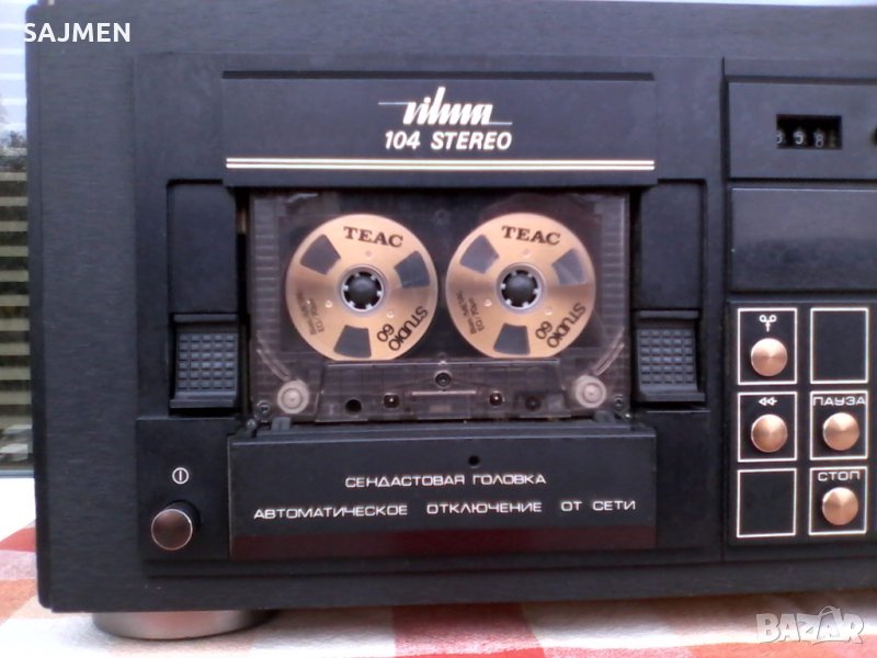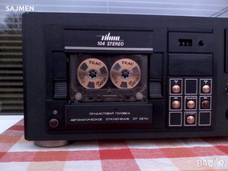 VILMA-104, RUSSIA TANDBERG Стереофонический магнитофон-приставка "Вильма-104-стерео" с 1986 года выпускалась Вильнюсским ПСЗ Вильма. Предназначена для высококачественной записи и воспроизведения фонограмм. В МП имеется: Сендастовая головка. Двухмоторный ЛПМ. Полный автостоп с отключением от сети. Квазисенсорное управление режимами ЛПМ. Компандерная система ШП. Стрелочные и светодиодные пиковые индикаторы. Возможность работы с 3 типами магнитной ленты. Скорость магнитной ленты 4,76 см/сек. Коэффициент детонации менее 0,12%. Диапазон рабочих частот на линейном выходе 31,5...18000 Гц. Относительный уровень шумов в канале записи-воспроизведения с системой шумоподавления минус 62 дБ. Потребляемая мощность 40 Вт. Габариты аппарата 480х168х320 мм. Вес 11,8 кг.ВНОС ОТ МОСКВА СССР;
