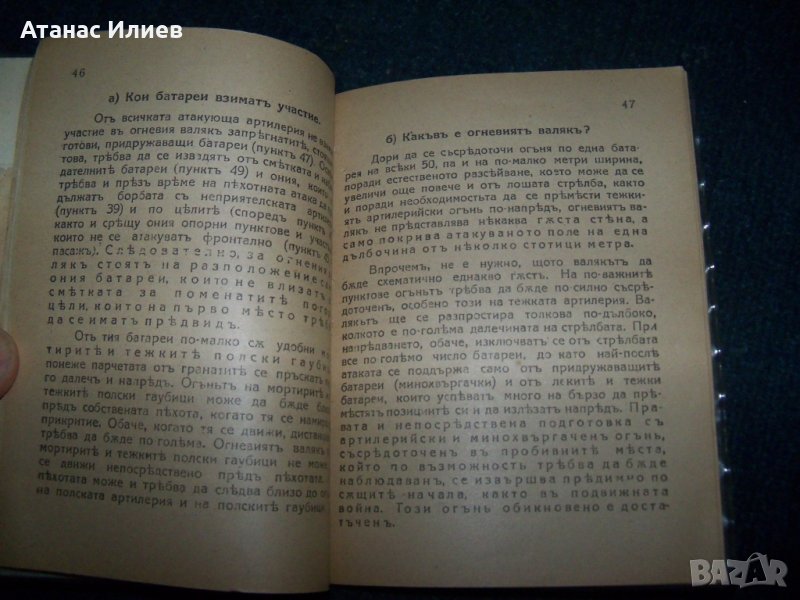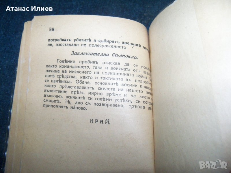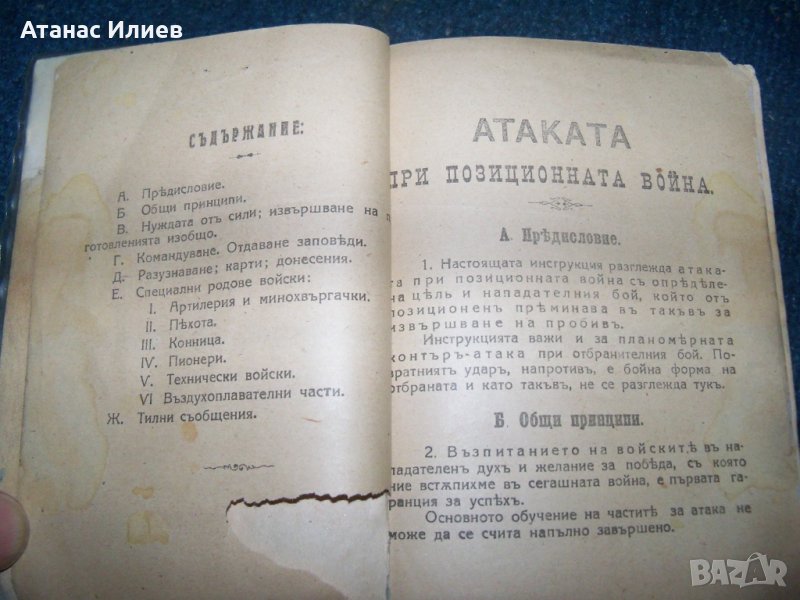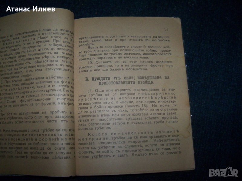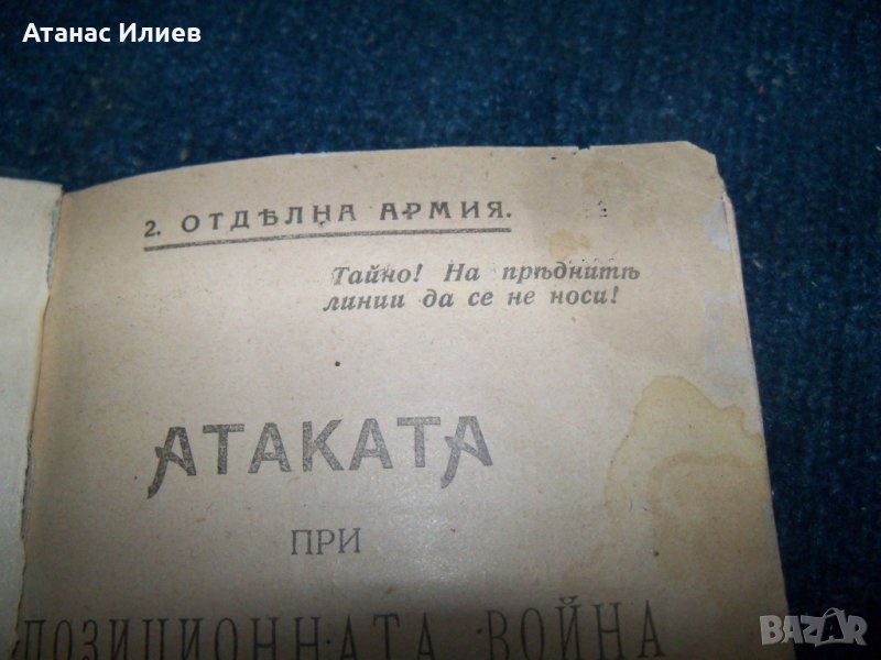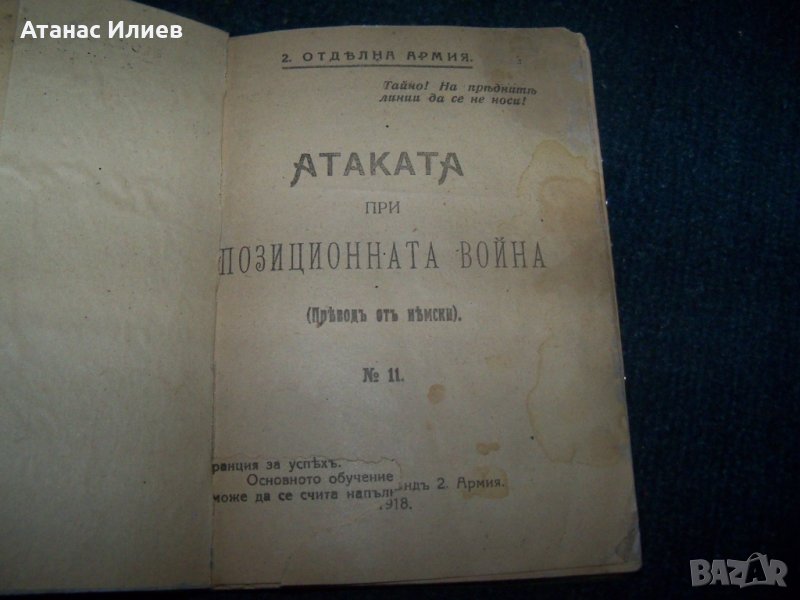 "Атаката при позиционната война" превод от немски. Книжката е предназначена само за командния състав и е издадена от 2-ра отделна армия през 1918г. Има изрично указание да се пази в тайна и да не се носи на предните линии. Книжката е подвързвана допълнително с картонени корици. Има закъсване на титулната страница, но като цяло е в много-добро състояние. Книжката е 98 стр.