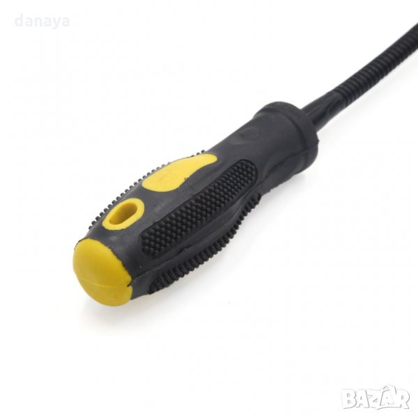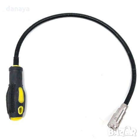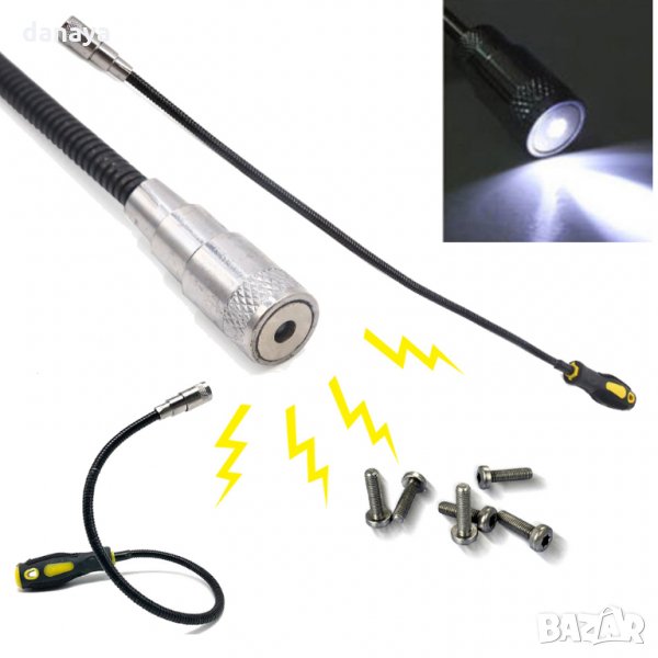 удължител. Магнит с лампа и гъвкаво рамо. Магнитна щека за изваждане на метални гайки, болтове, винтове и други метални части от недостъпни за ръцете и очите места. Магнит с гъвкаво удължение, който винаги е нужен в дома, гаража, двора и офиса. Особено приложим и за ремонт на автомобили.