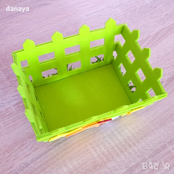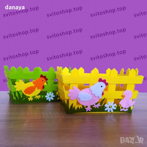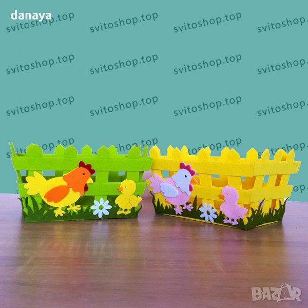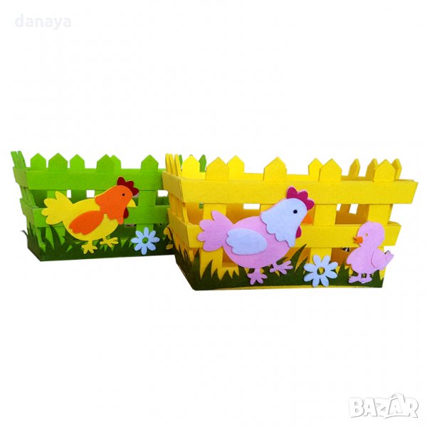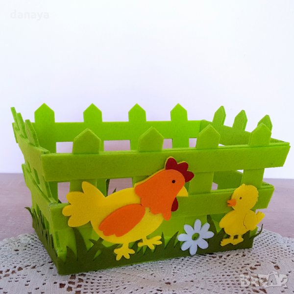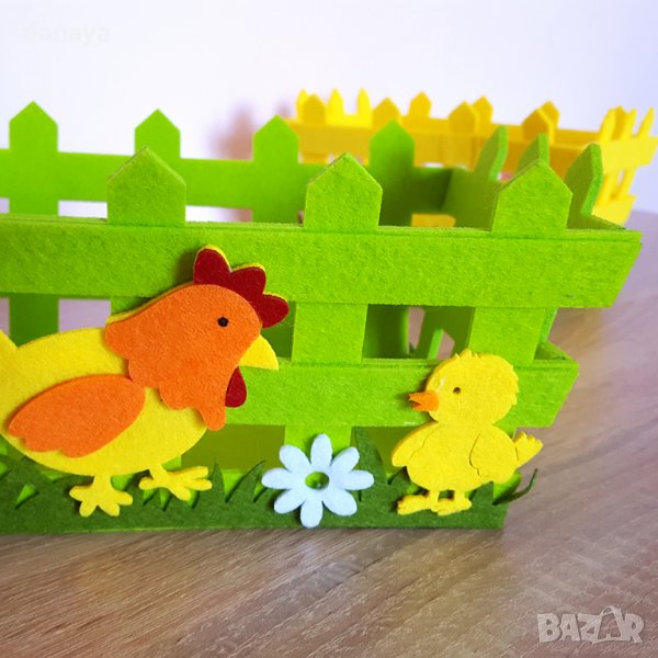 Великденски панер за яйца и лакомства. Великденска декорация за маса. Украса за Великден. Всеки великденски панер е изработен от еко плат. Лицевата част е украсена с кокошка и пиленце. Предлага се в два цвята - зелен и жълт.